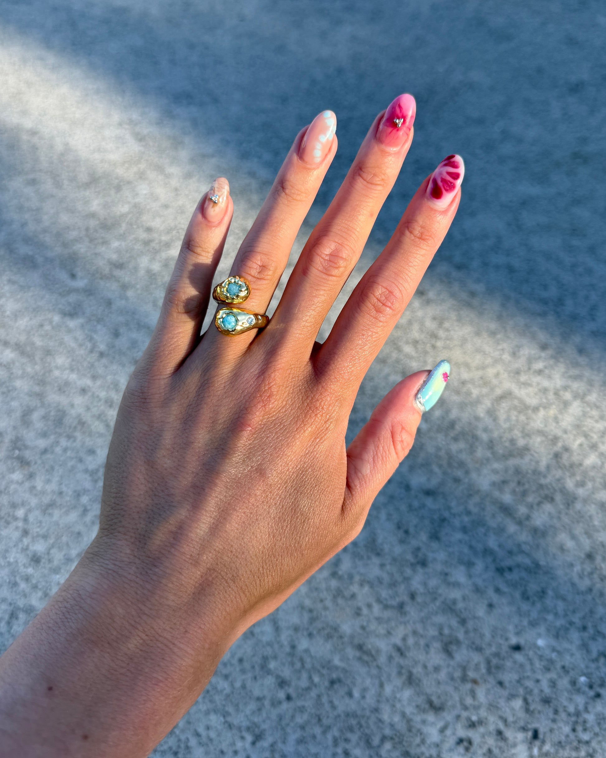 Featuring two turquoise-hued amazonite stones set into molten-textured 18ct gold plating and set on a 925 sterling silver base, it’s finished with a single aquamarine zirconia for a little extra sparkle. Designed to be adjustable, each detail evokes a found-treasure feel - like something you stumbled upon during golden hour at low tide.