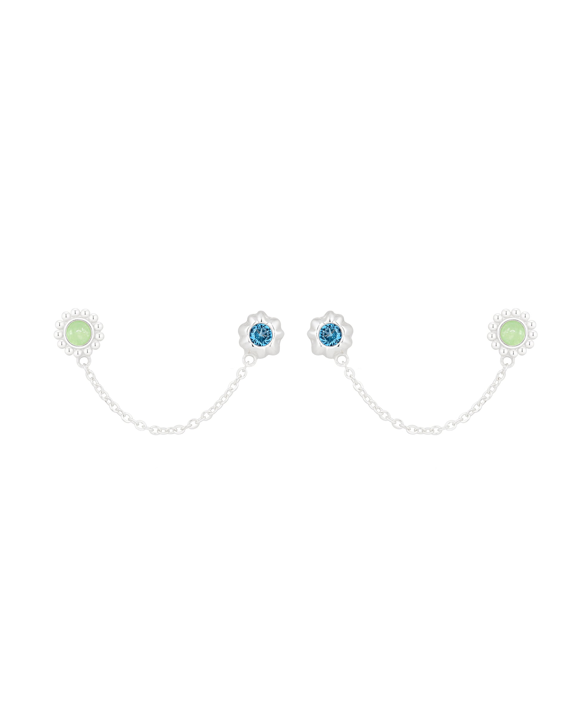 These double stud chain earrings are a fresh twist on a classic stud. Crafted from 925 sterling silver, each set features a natural jade stone in one flower-shaped stud and a brilliant aquamarine cubic zirconia in the other - linked by a delicate gold chain that dangles between two piercings.
