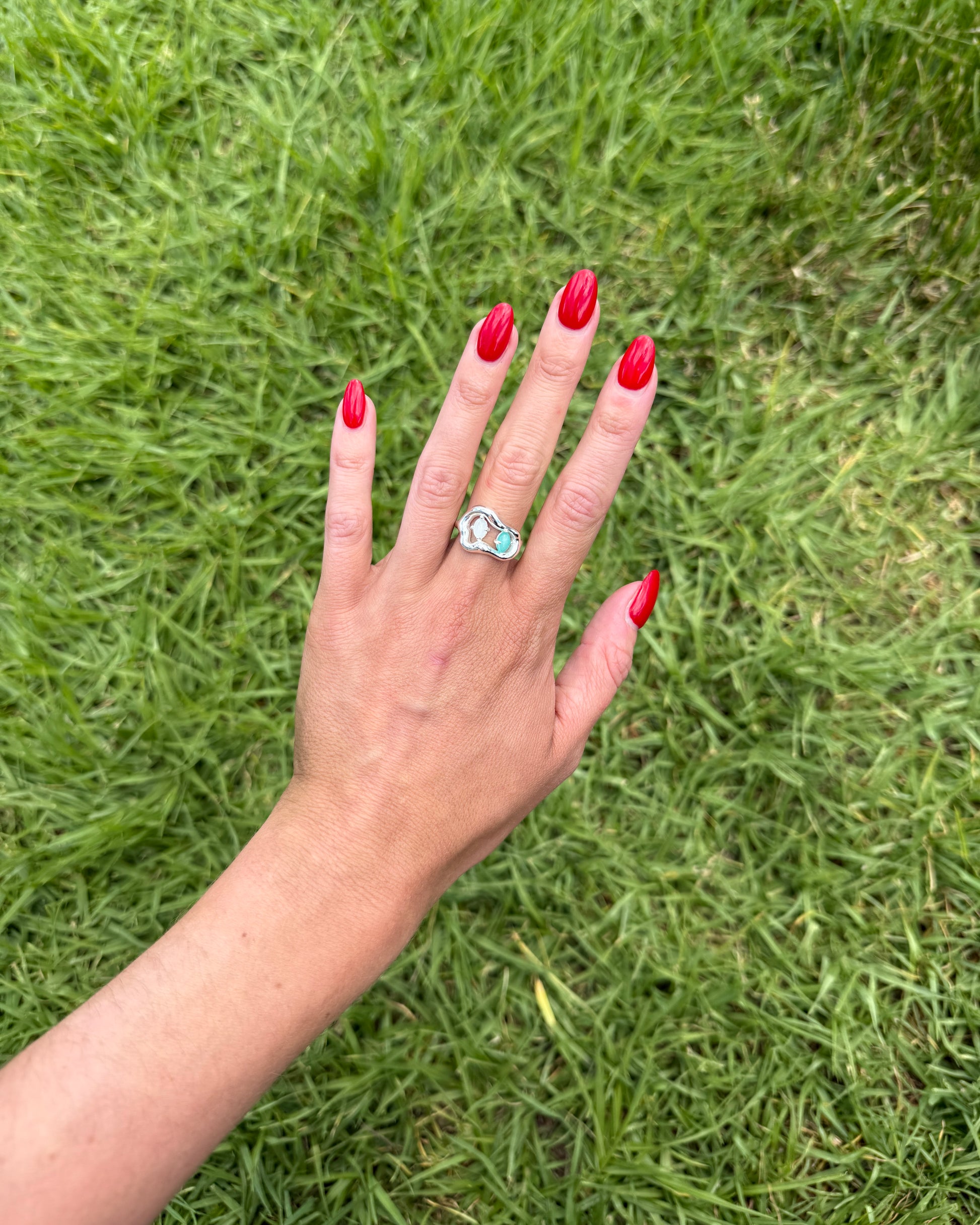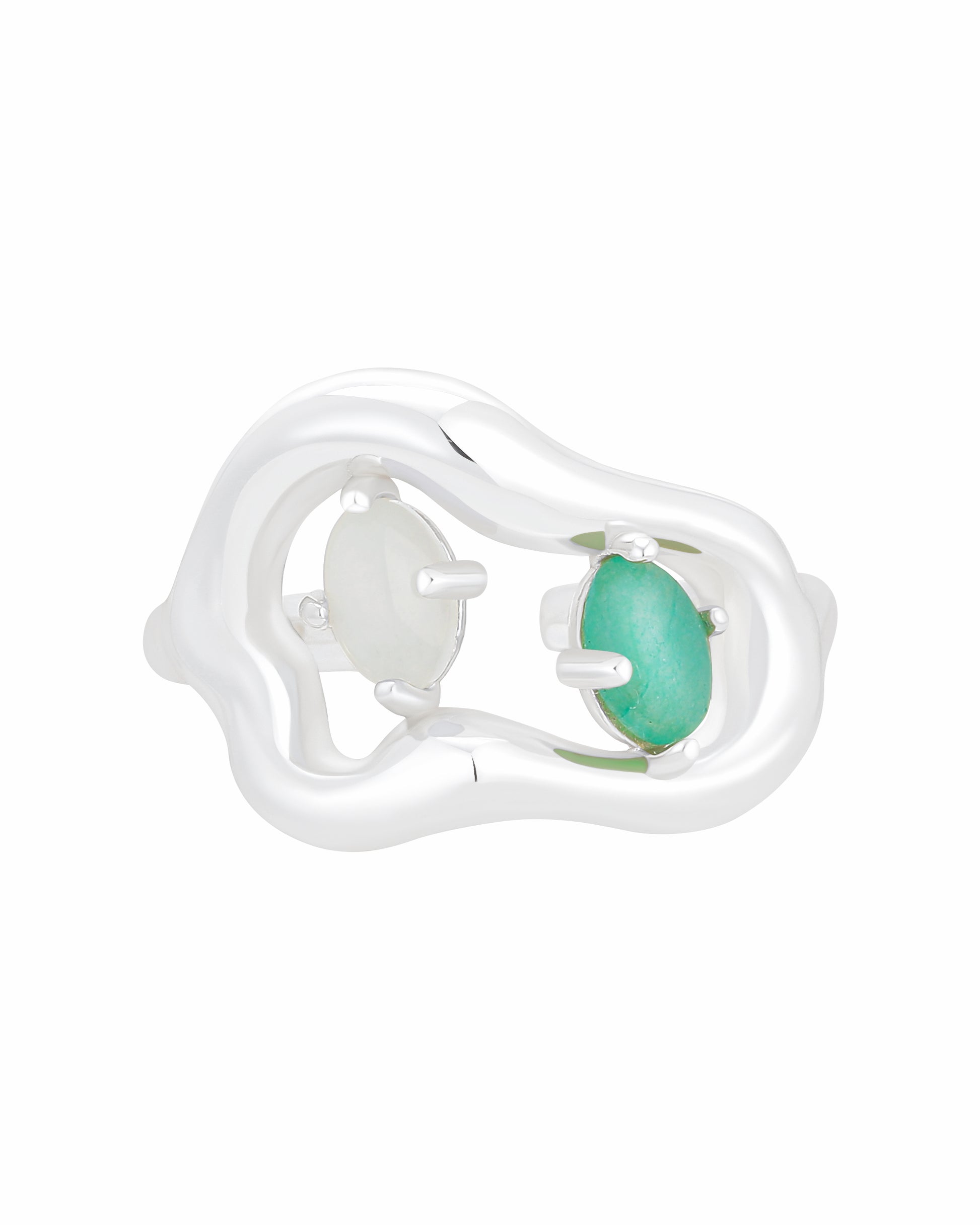 This sculptural ring plays with negative space and colour contrast - a modern piece that feels artful yet effortless. Crafted from 925 sterling silver, it showcases one natural oval optimize aquamarine and one natural oval amazonite stone, each set between fluid, molten-inspired gold curves.