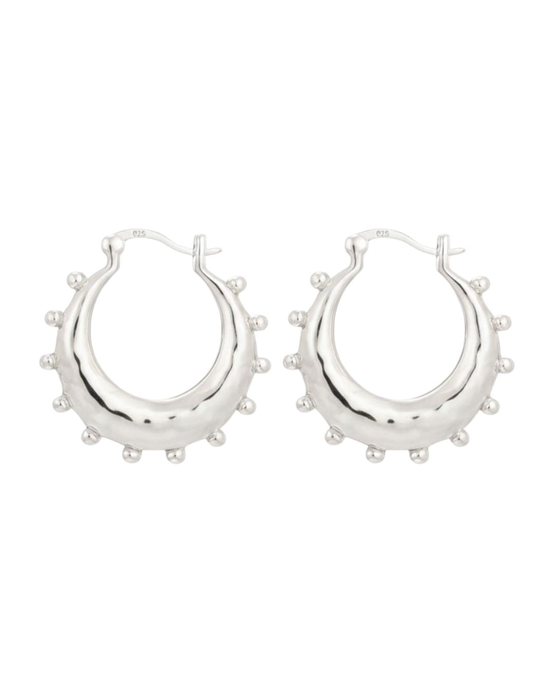 These sculptural hoops put a fresh spin on a classic silhouette. Crafted from 925 sterling silver, each crescent-shaped earring is trimmed with delicate silver dot accents for added texture and personality. Lightweight with a secure hinged clasp, they’re made for effortless everyday wear—yet striking enough to steal the spotlight.