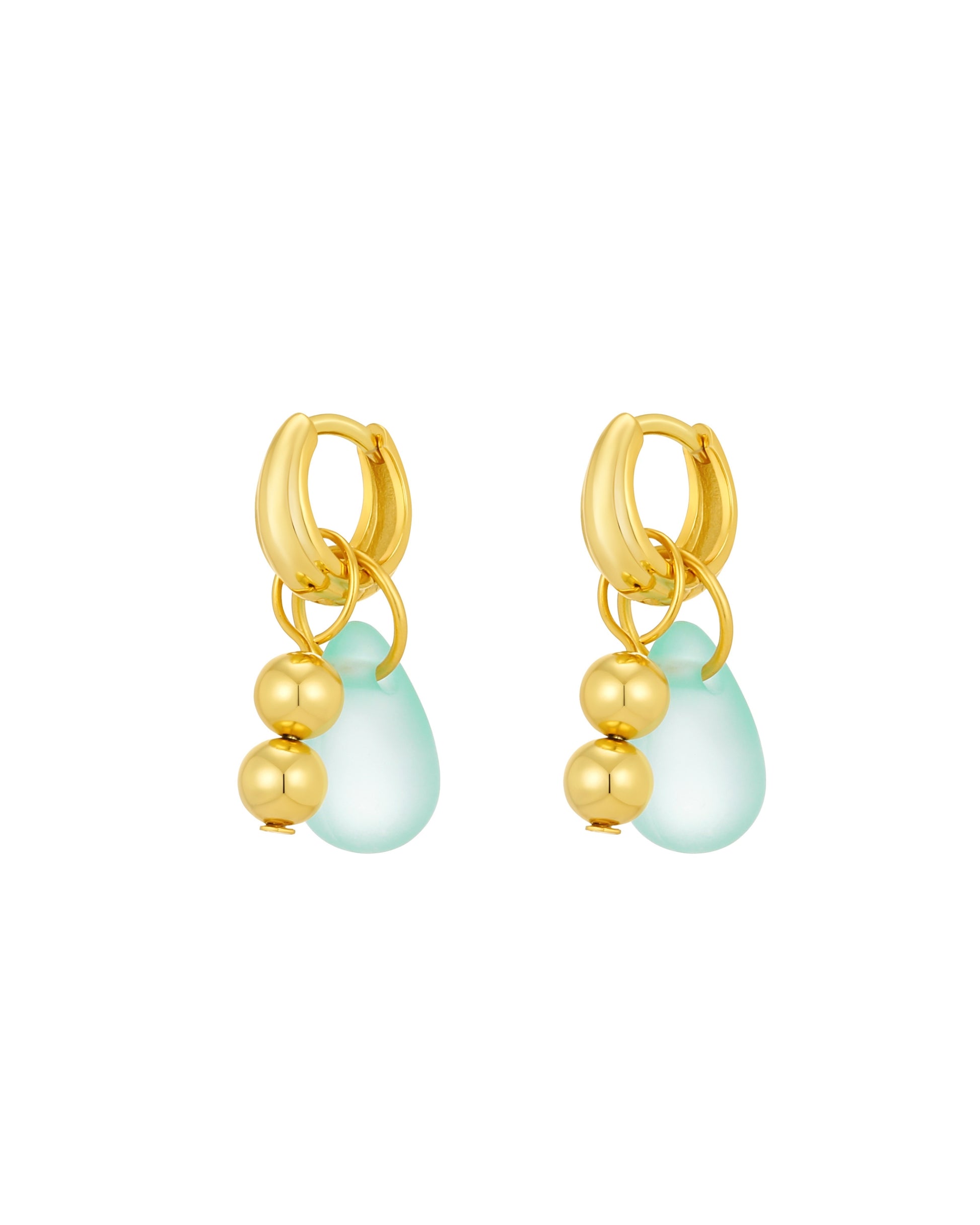 A play on our signature Cielo earrings, these mini version are your new everyday go-to. These 18ct gold-plated sterling silver huggie earrings feature delicate dangling charms, combining polished gold spheres with a luminous light blue frosted glass bead. The gentle sway and subtle contrast create a refined balance of texture, colour, and light, delivering an elevated yet easy-to-wear statement.