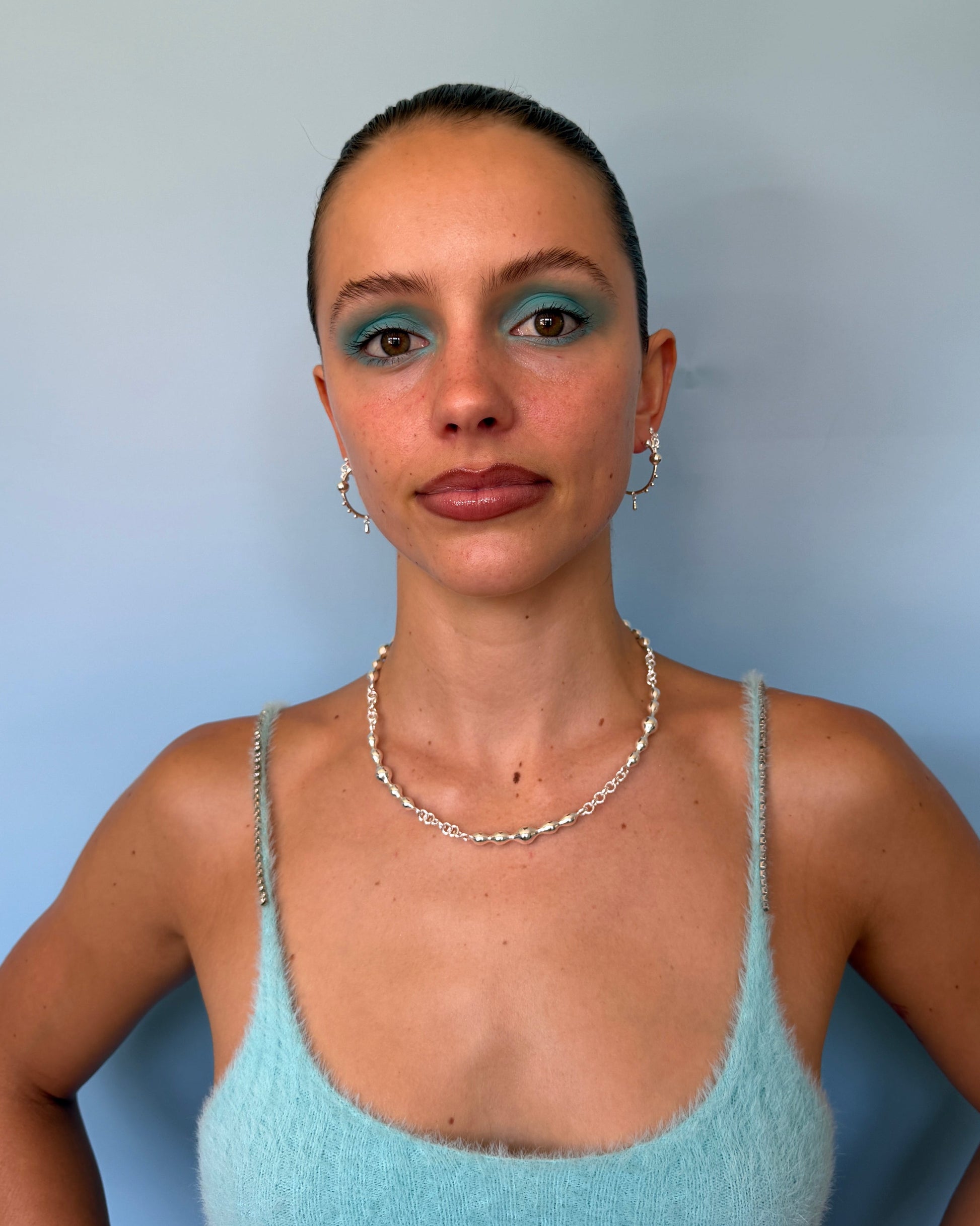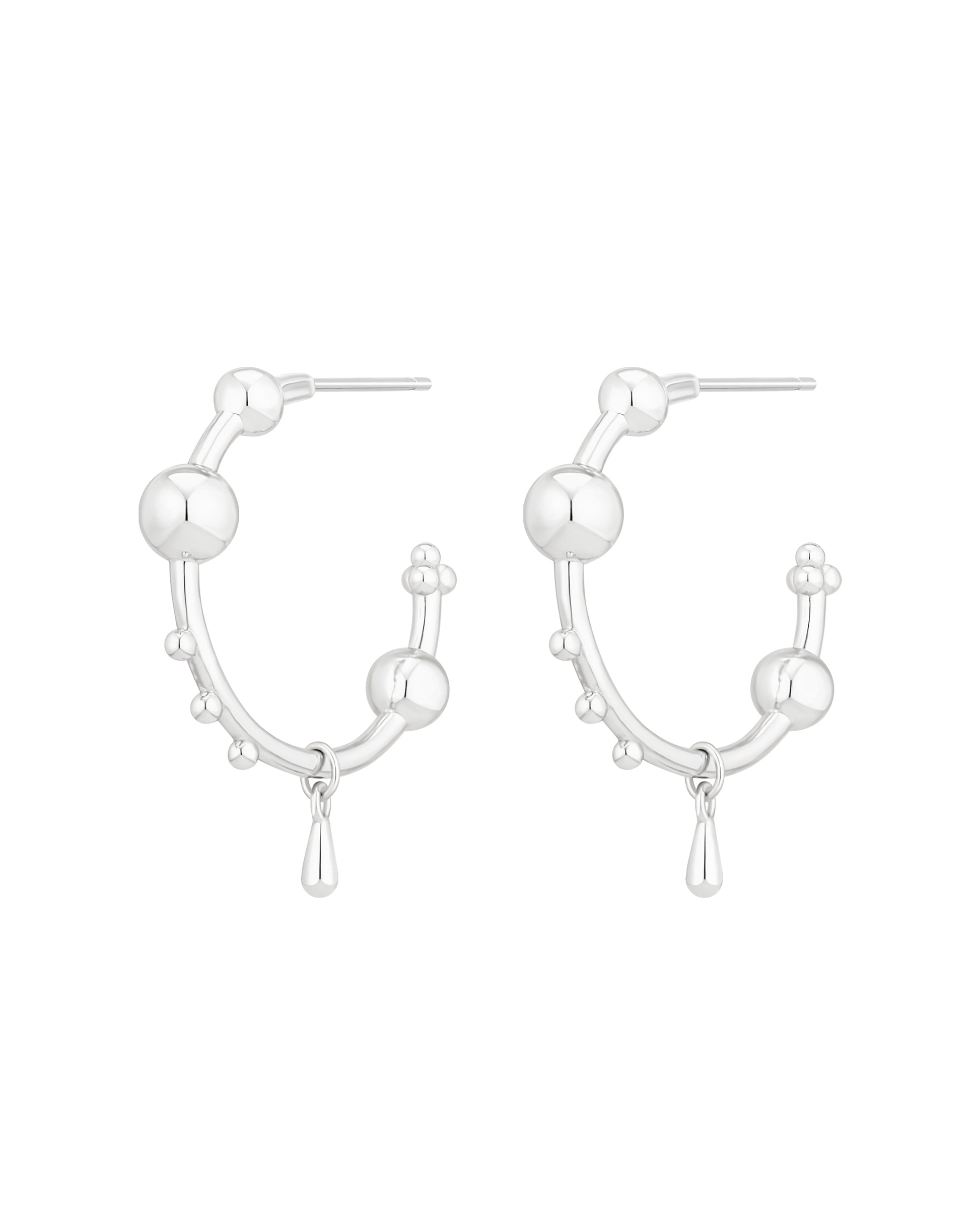 Designed to stand out from every angle, these beaded hoop earrings bring texture, dimension and fluid movement into one striking silhouette. Featuring polished silver spheres along the curve and a delicate dangling teardrop charm, they feel bold yet beautifully balanced.