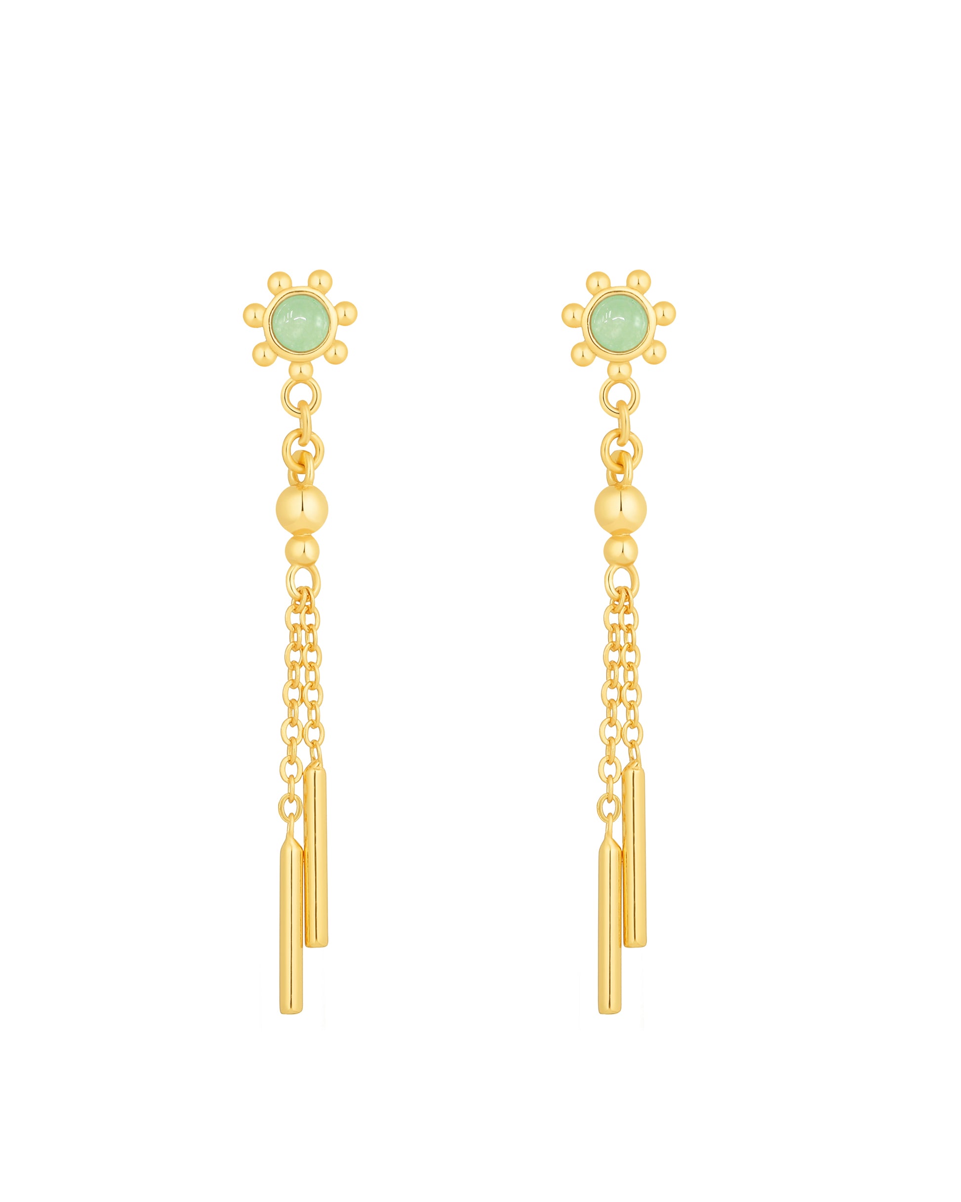 These playful-yet-polished drop earrings bring a touch of botanical charm to your stack. Designed with a daisy-style stud featuring a natural light green jade, each earring falls into dual chain drops finished with sleek gold bars for modern movement. Crafted on a 925 sterling silver base and plated in 18ct gold, they’re lightweight and perfect for adding a little swing to your step.