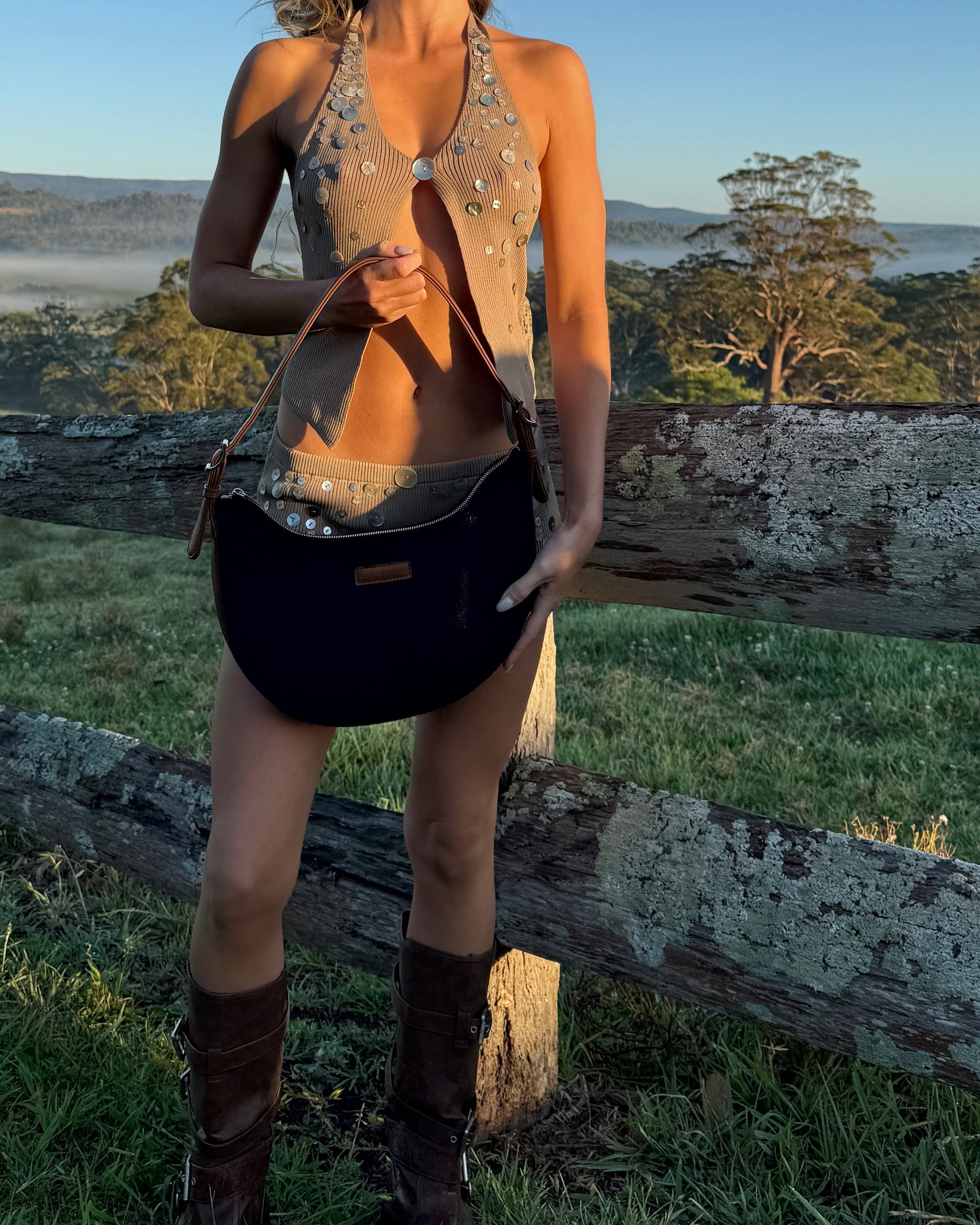 This elevated crescent bag is designed for those who move with style. Crafted from plush black faux cowhide, it brings rich texture and bold attitude to any look. The contrast tan vegan leather strap curves perfectly over the arm for easy, everyday wear.