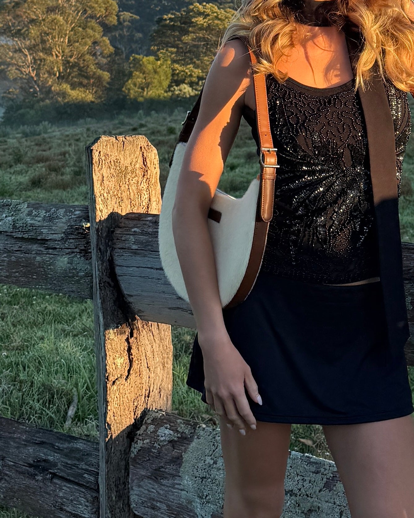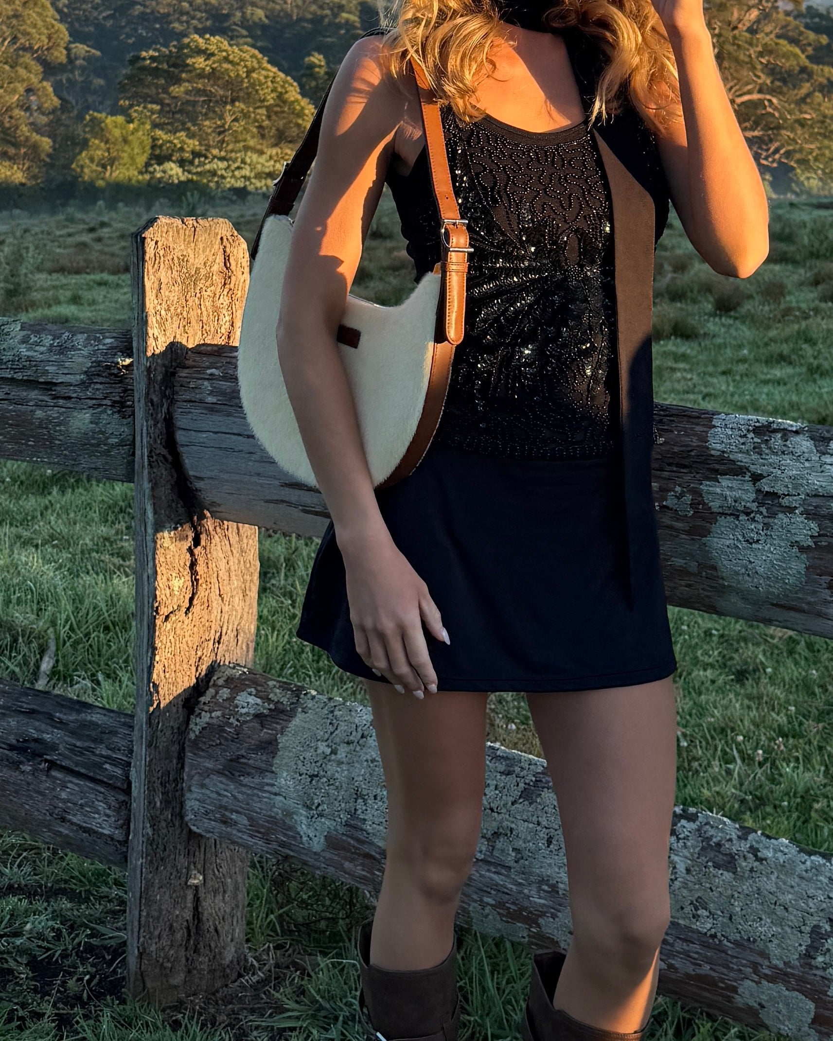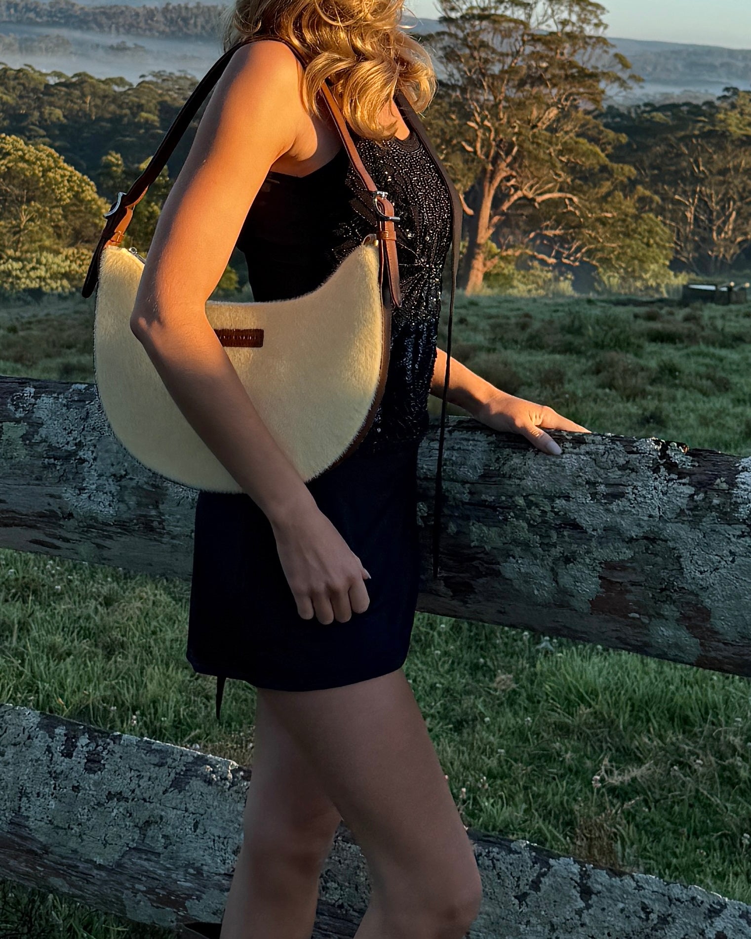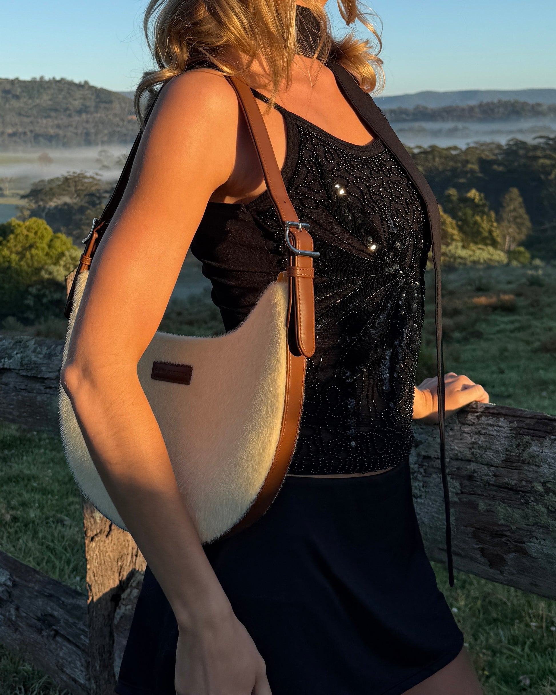Soft, sculptural and seriously wearable - this crescent shoulder bag is crafted from buttery cream faux cowhide with a smooth tan vegan leather strap, bringing luxe texture and timeless tones together in one effortless piece.