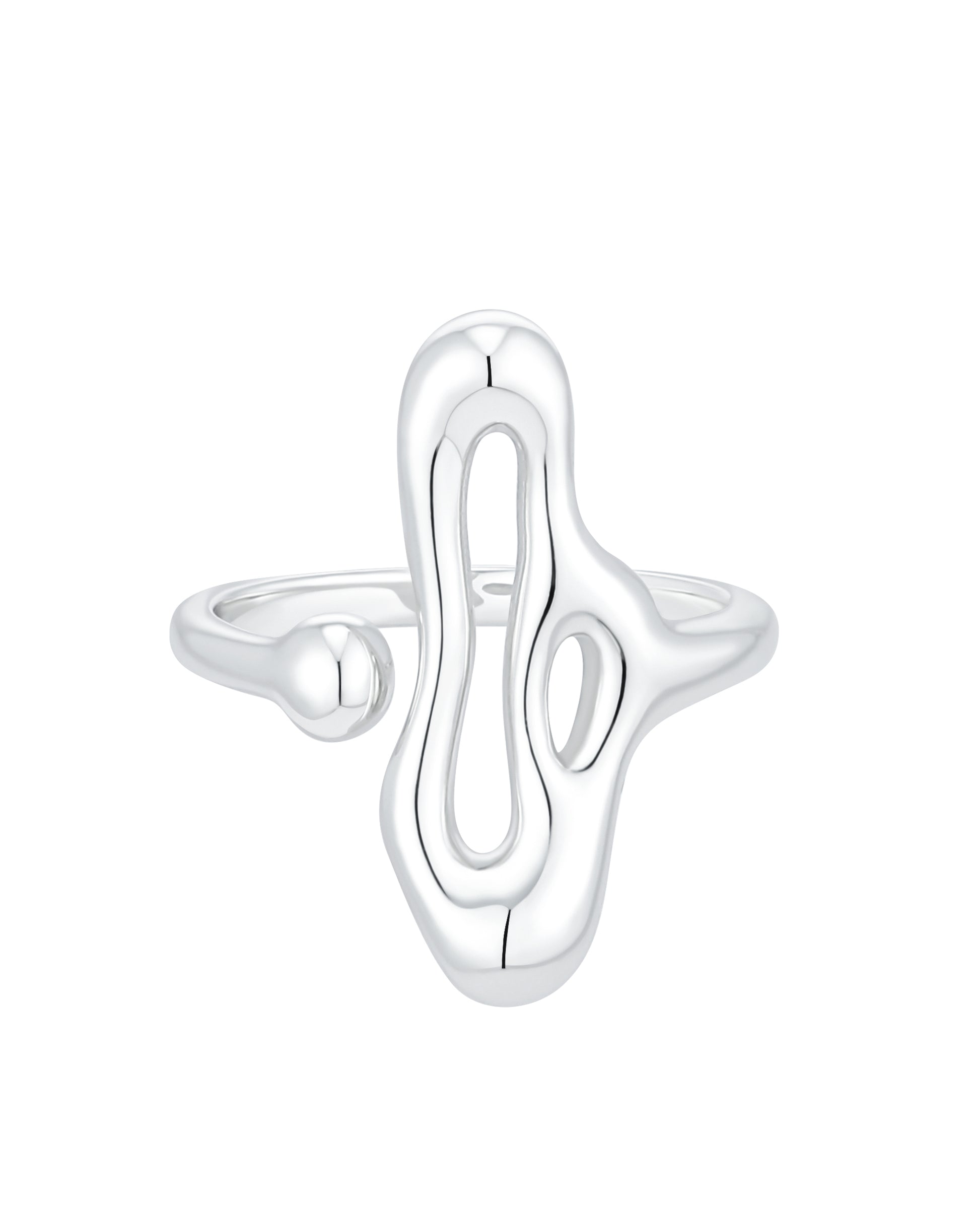 This 925 sterling silver statement ring features an abstract, flowing silhouette inspired by organic movement and modern form. Its polished curves and open structure create a dynamic sculptural presence, delivering bold visual impact with a refined, contemporary edge.